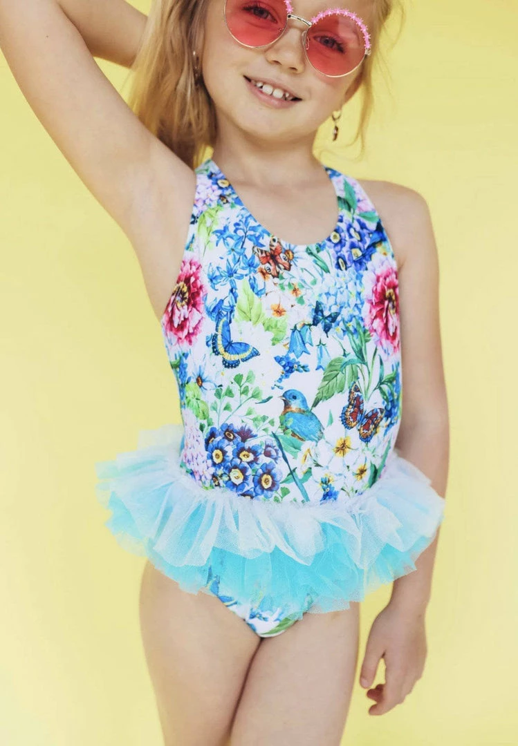 White and floral printed one piece with blue tulle and bird accents! Comes with a matching swim cap.
