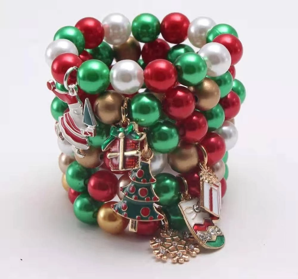 Red and green bracelet stack with assorted Christmas charms! Comes in a pack of 6 total bracelets!