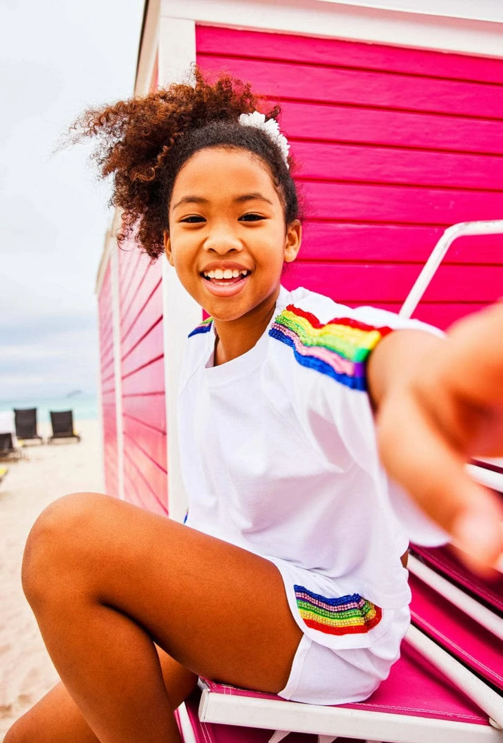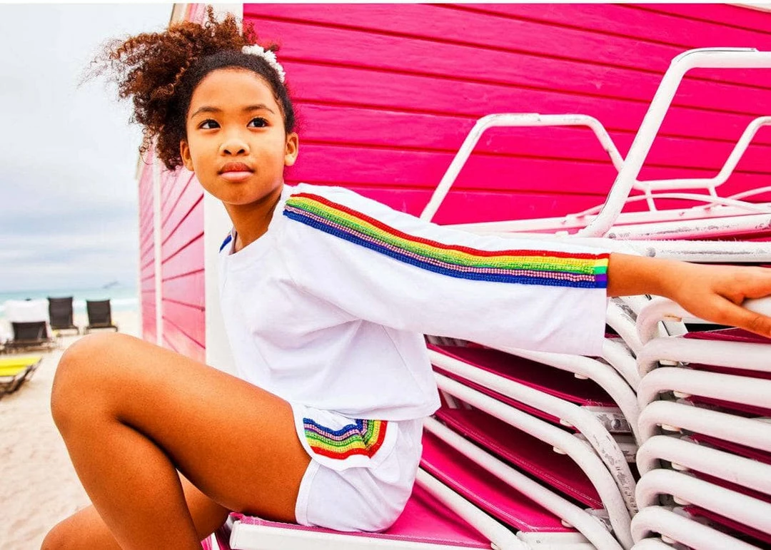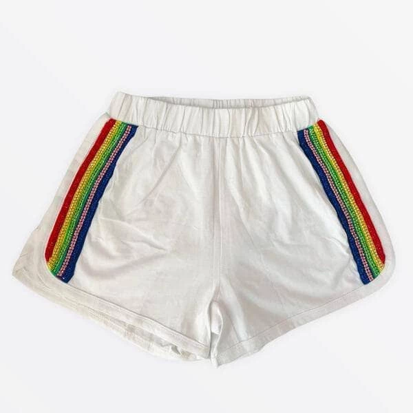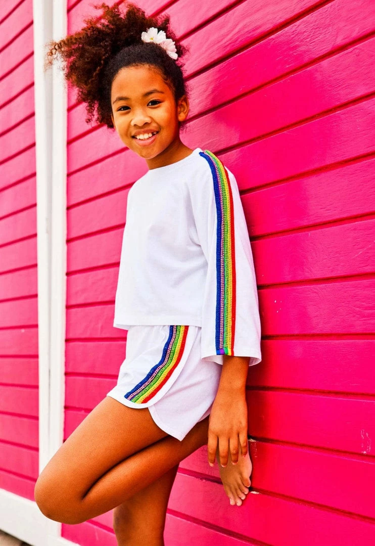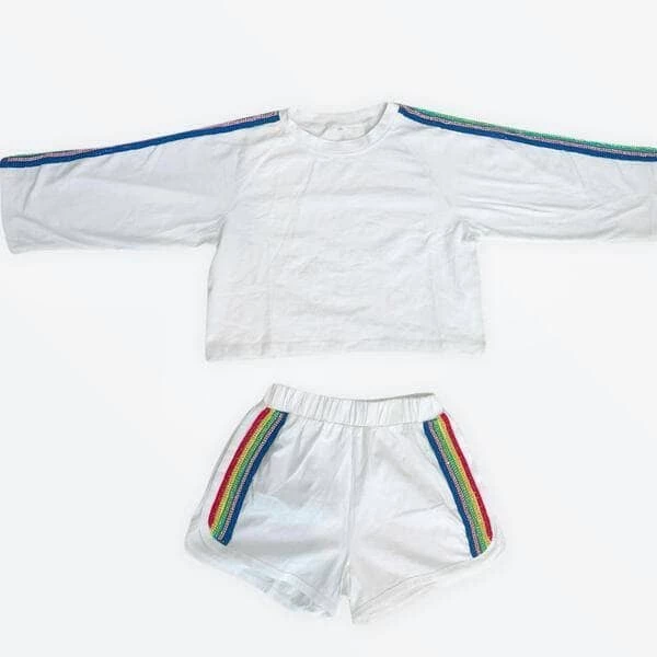 If you are looking for a sporty outfit, here’s the perfect one for you! A matching sporty set in white with beautiful crystal rainbow details make this sporty and funย