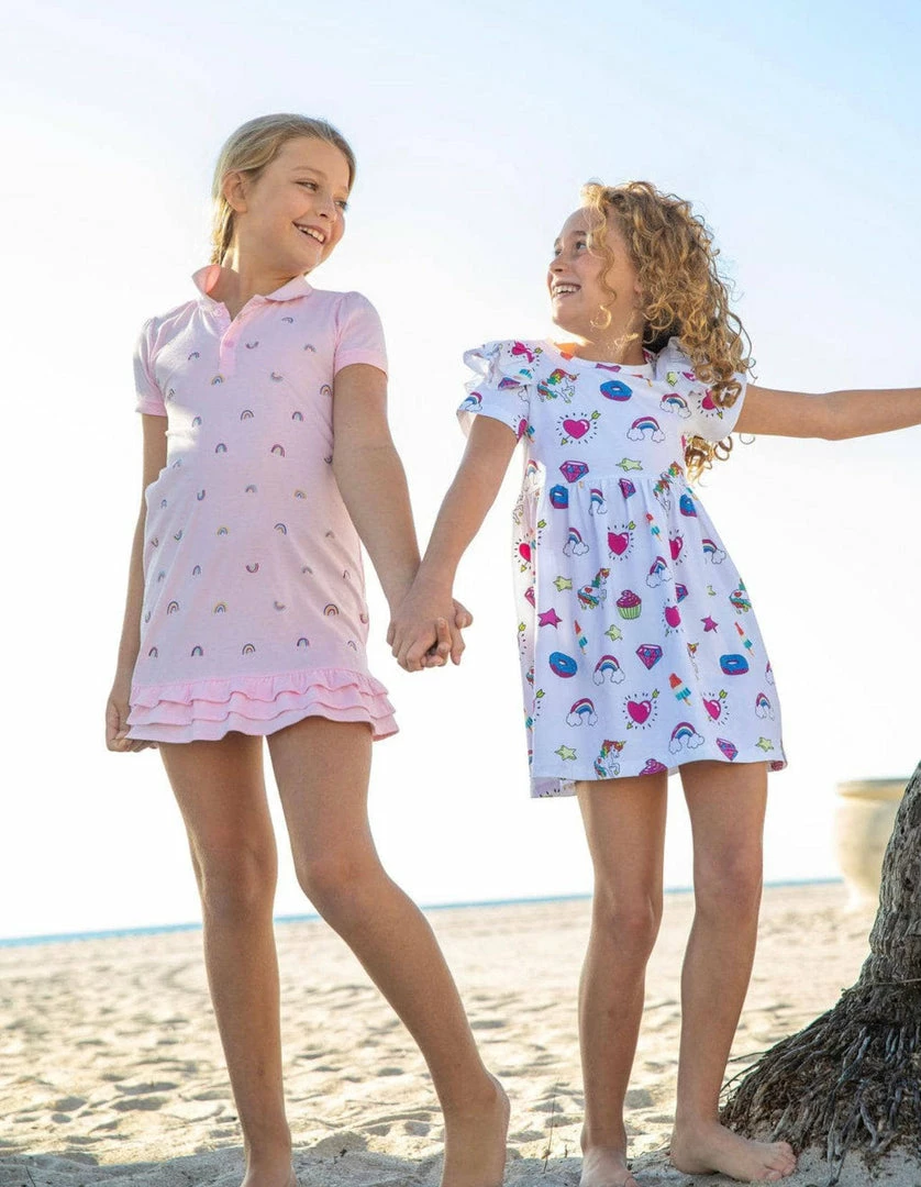 This magical dress is made of a lightweight cotton, and has ruffled shoulders, a flared skirt, and adorable donuts, rainbows, unicorns and more fun designs all over!