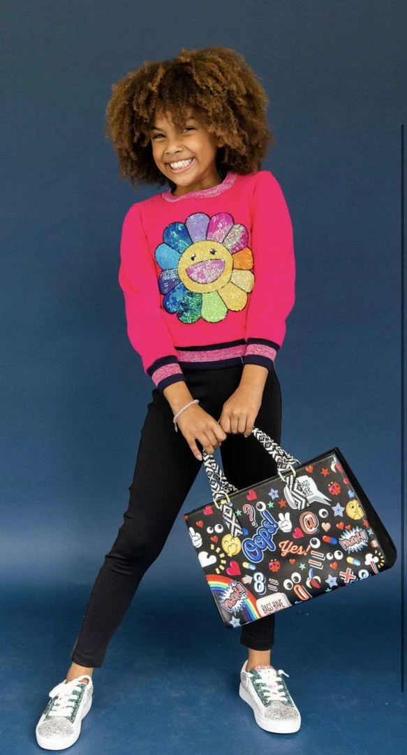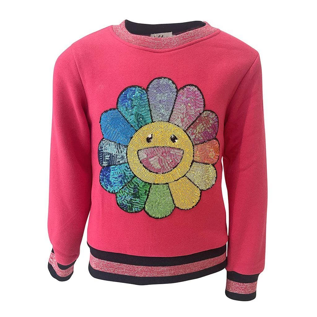 Peachy pink plush and soft crew neck with sequin flower smiley patch!Β
