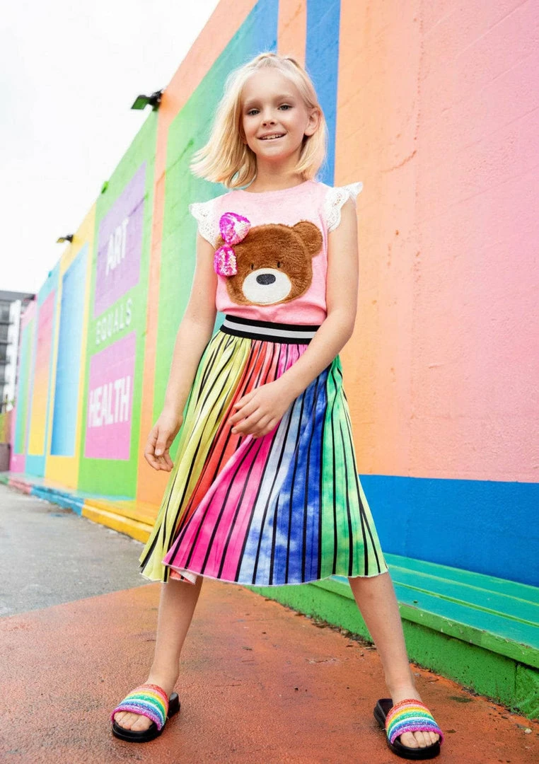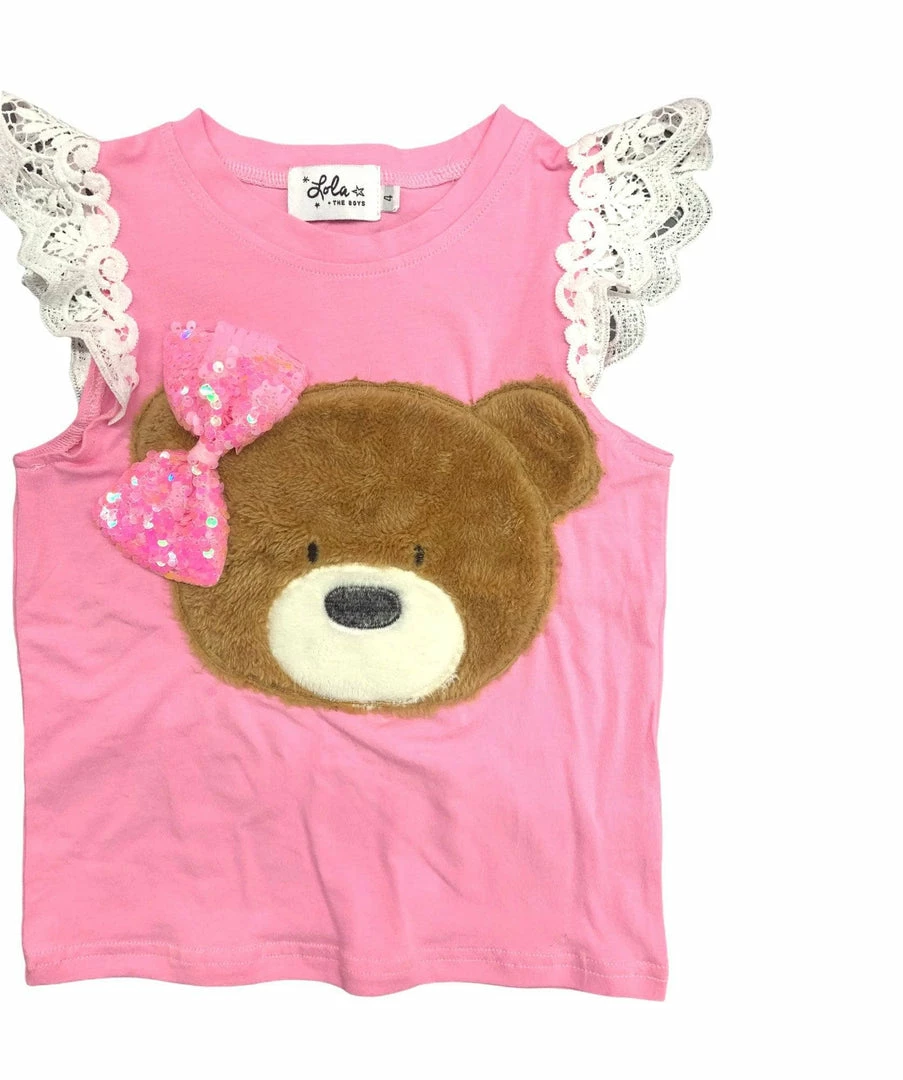 Pink heathered tank with lace sleeve details and fuzzy teddy bear patch with pink bow!Β