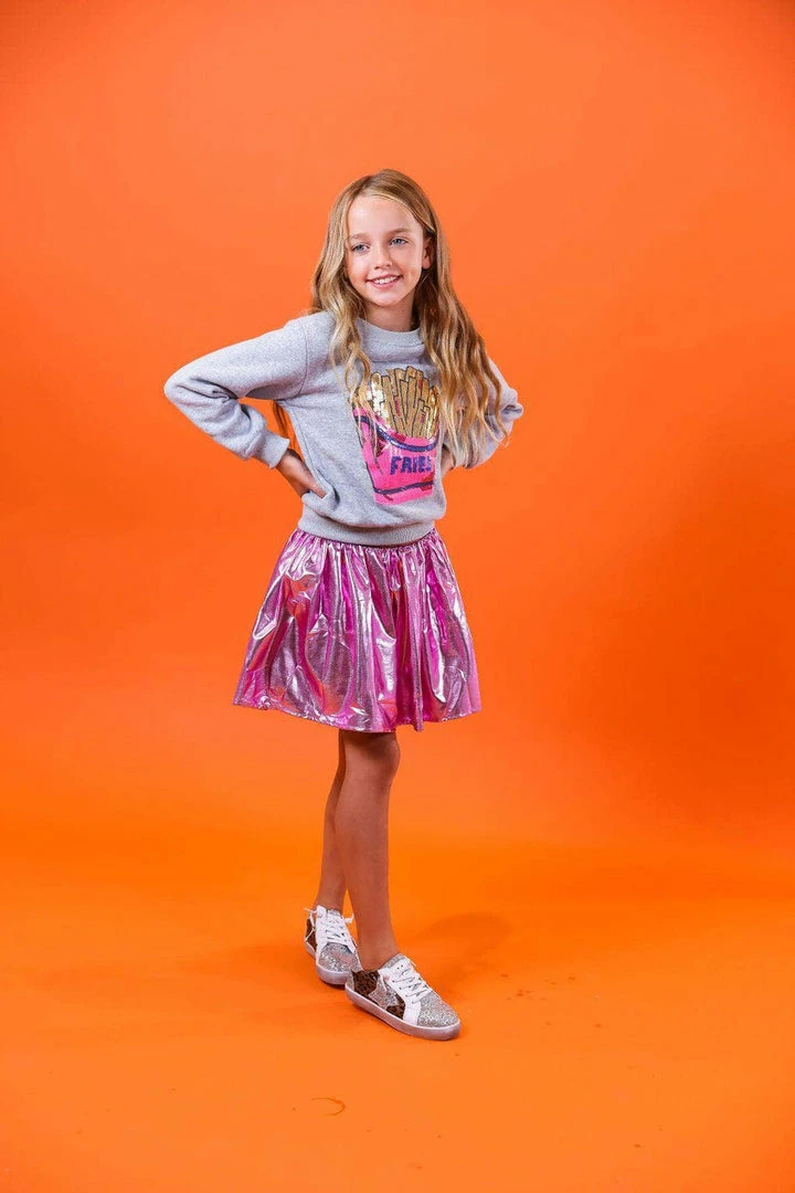 Soft cozy fleece sweatshirt with our best selling sequin French fry patch. We love French Fries!
