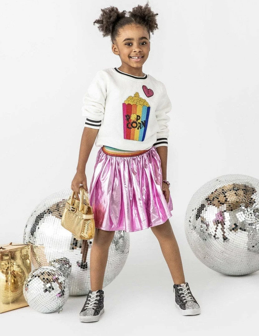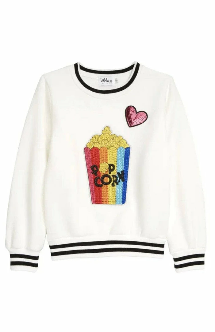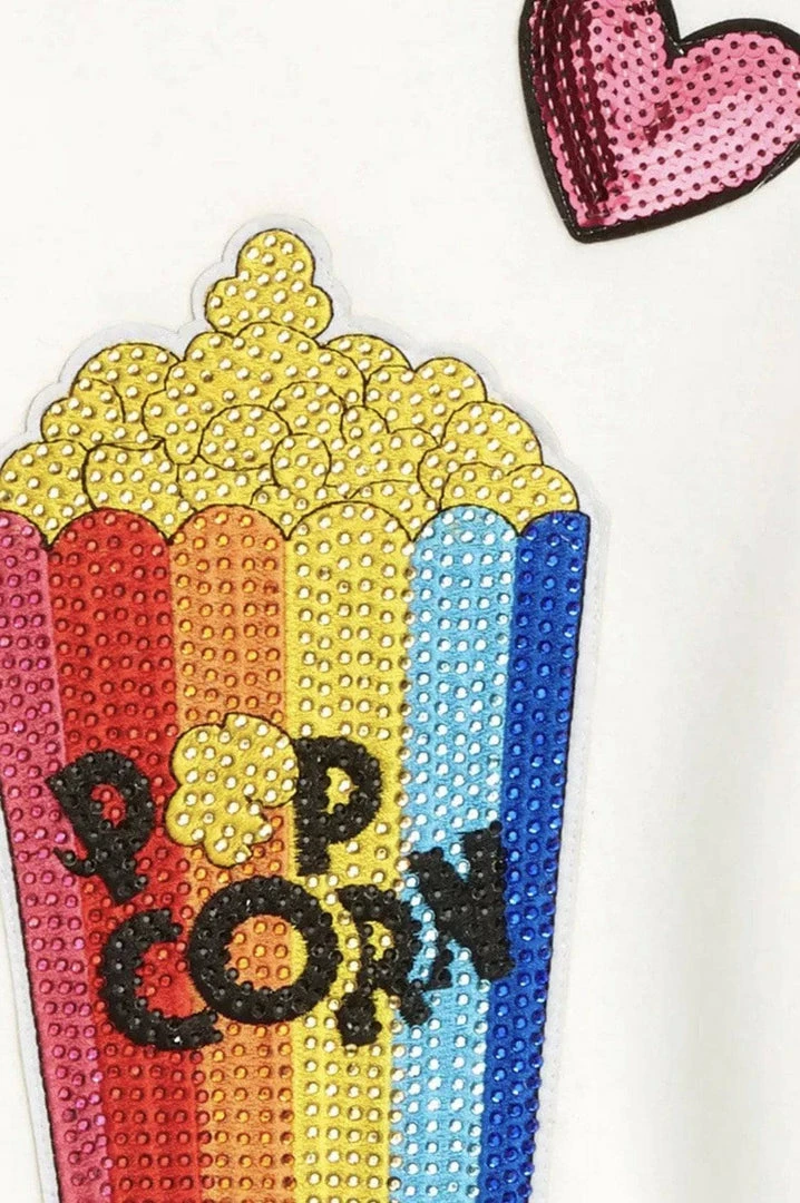 Girls Soft Popcorn Love Sweatshirt With Crystal Studded Popcorn Patch And Sequin Heart Patch