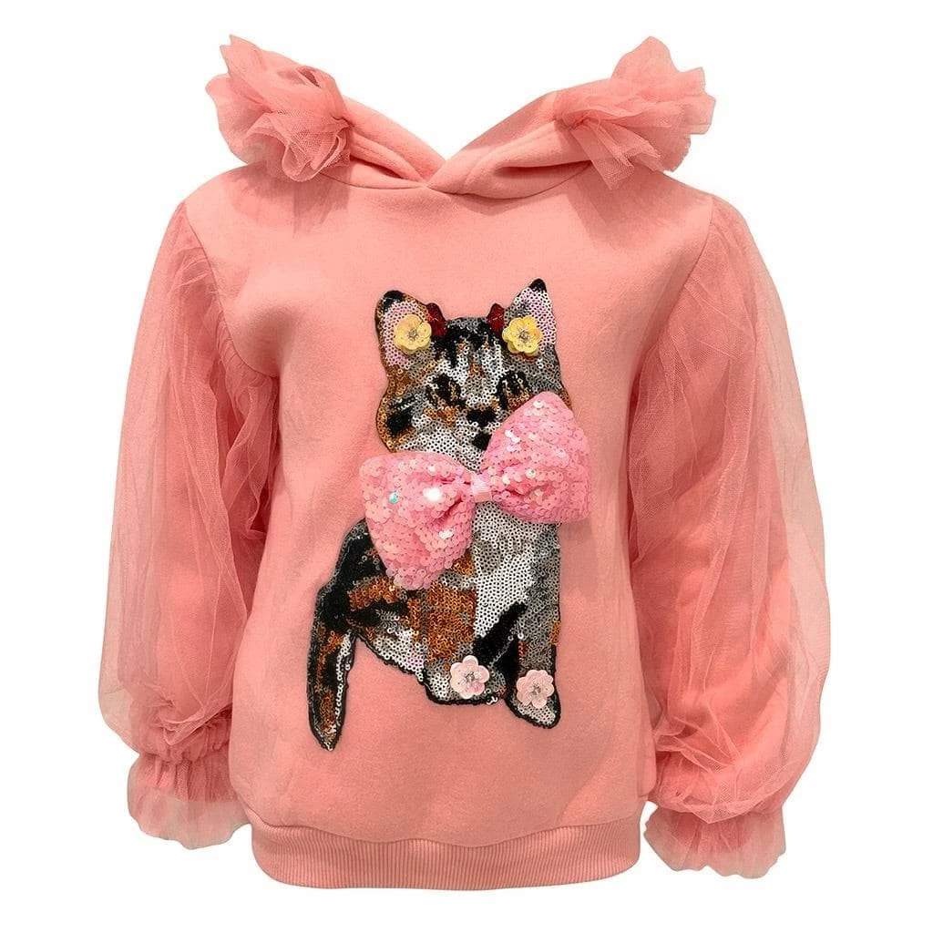 pink hoodie with sequin kitty and bow