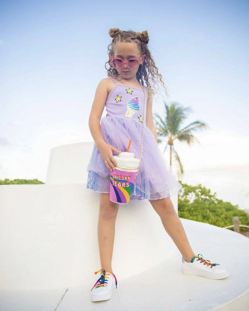 White structured sneakers with rainbow laces and a rainbow on the outside of the shoe!ย