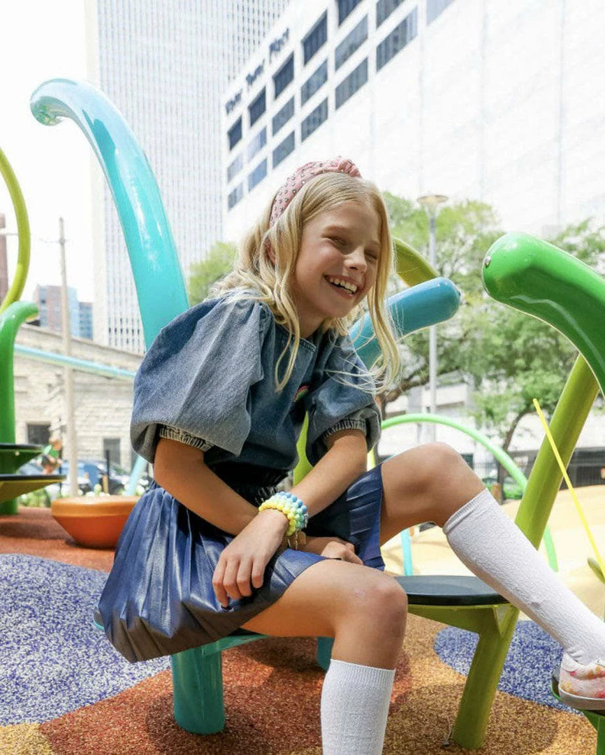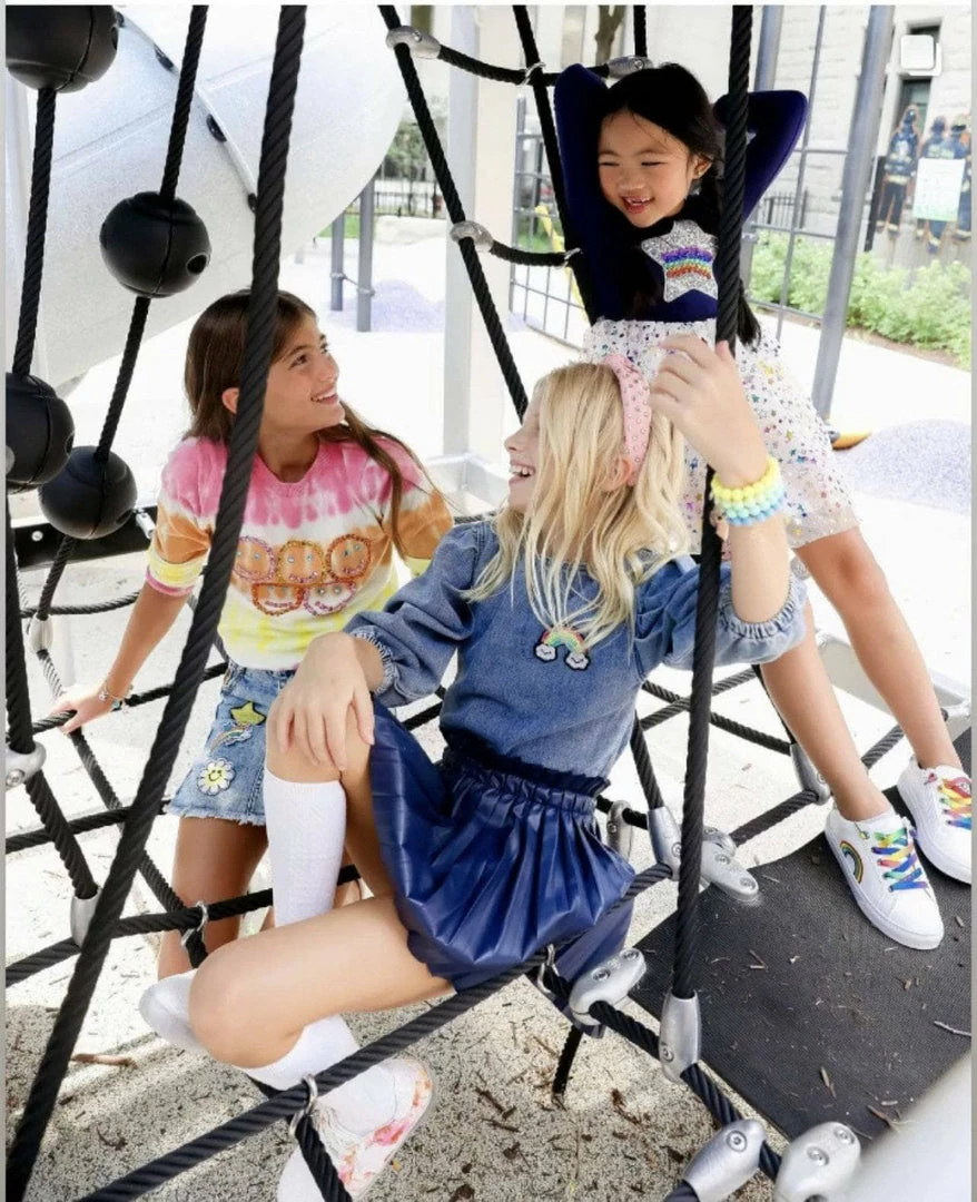 Lightweight denim bell sleeve top with happy rainbow patch! Zipper fasten in the back.Β