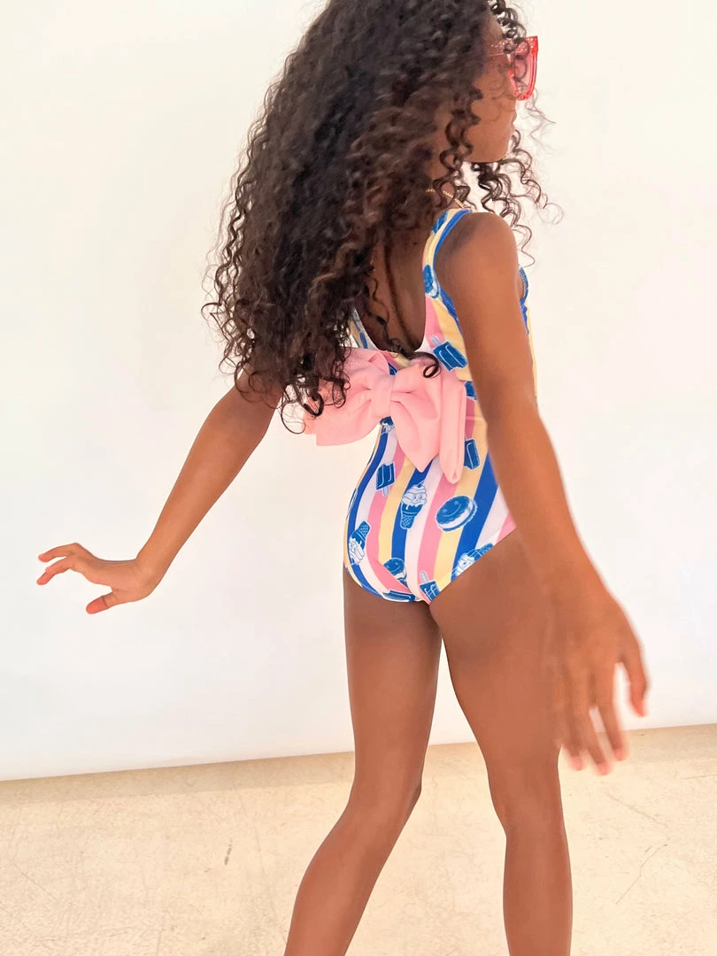 The cool summer swimsuit with cupcakes and stripes and the prettiest big pink bow