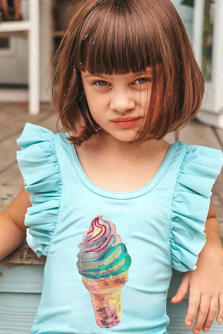 Cute ruffle trim on the shoulders and legs make this sequin ice cream suit the sweet for winter vacations and summer fun!ย