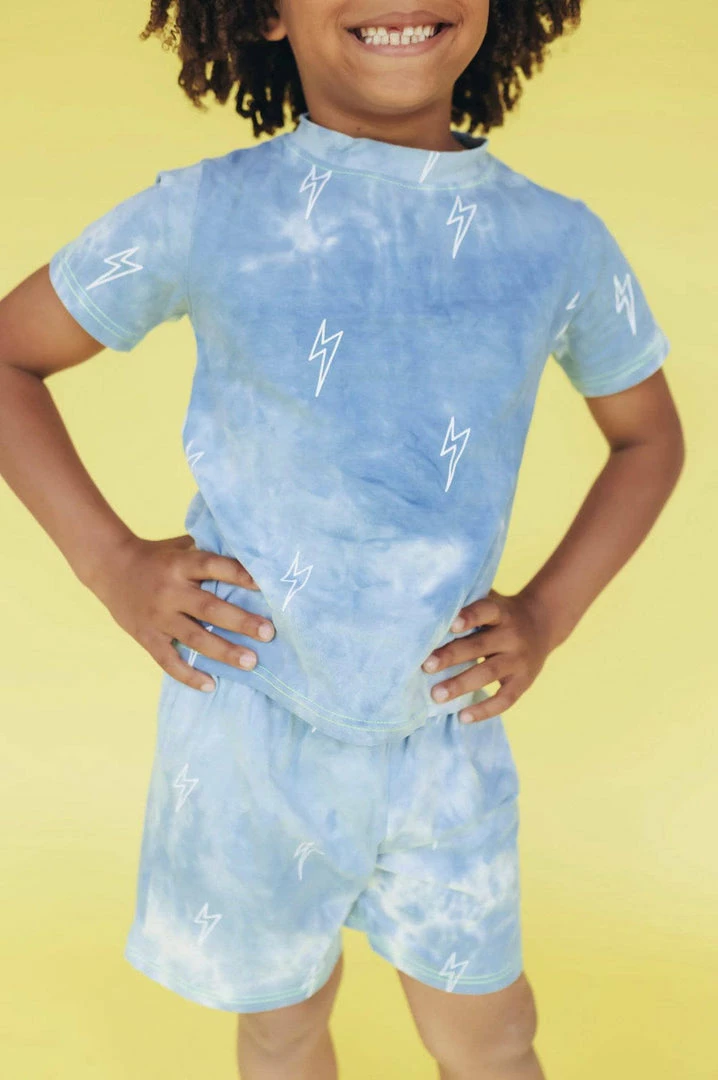 Grey tie dye with white lightning flashes Β cotton material short sleeve shirt and comfy shorts set!Β