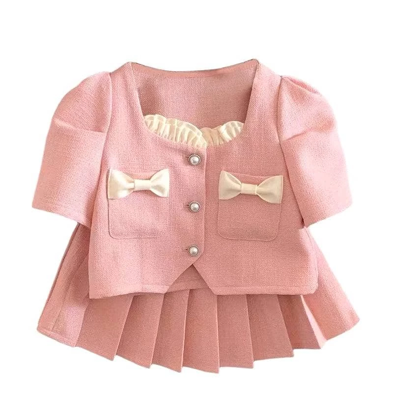Linen suit with short sleeve little blazer top with bows and a matching linen pleated skirt