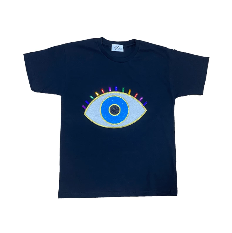 Short sleeved cotton tee embellished with heavily beaded rainbow evil eye, coming in white and black tee colorsΒ