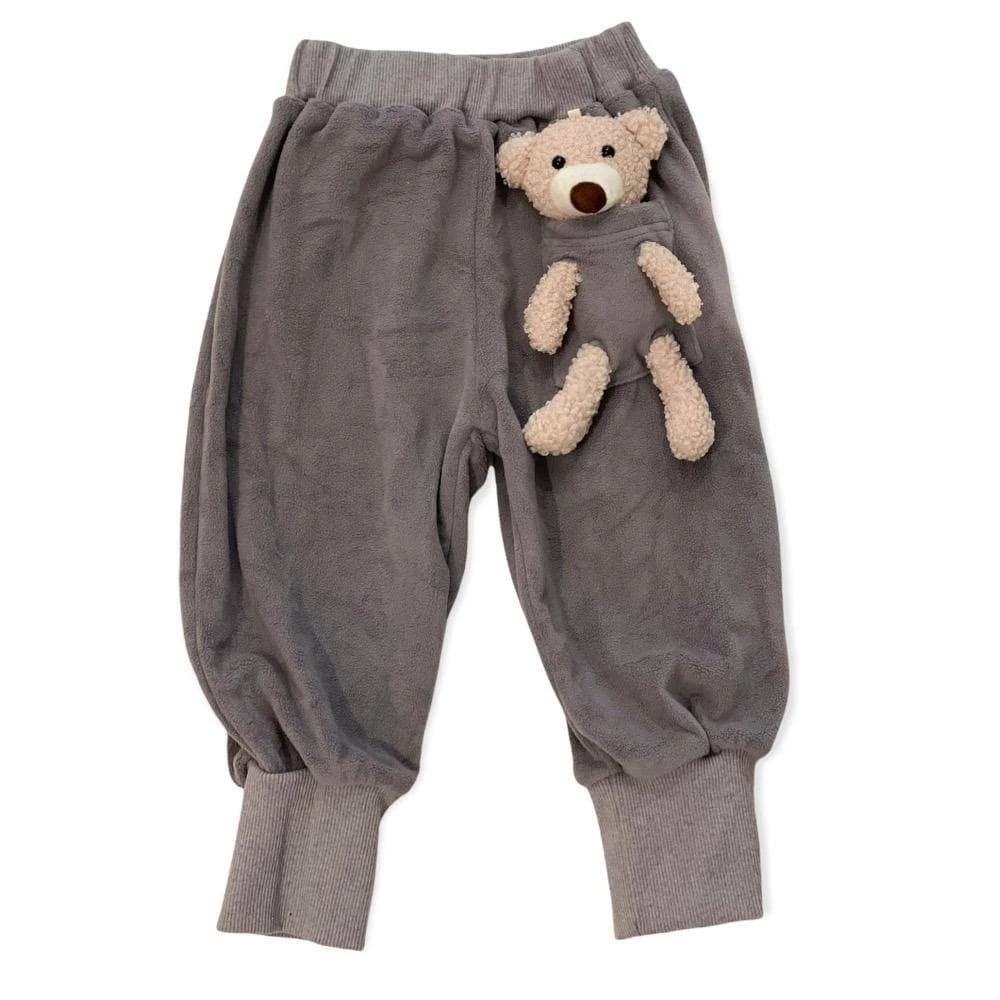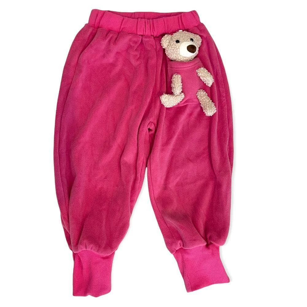 Polar fleece joggers with a 3D teddy bear best friend in the pocket!Β
