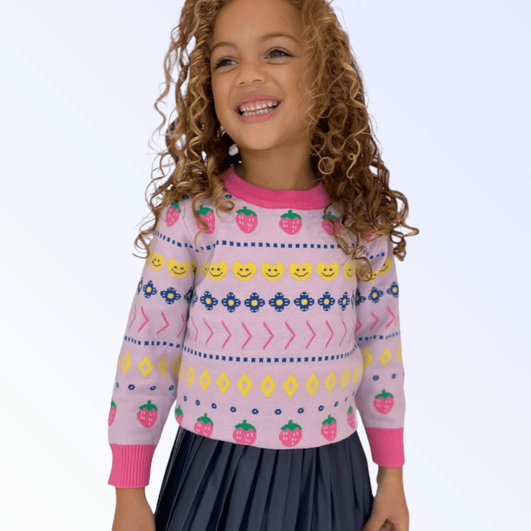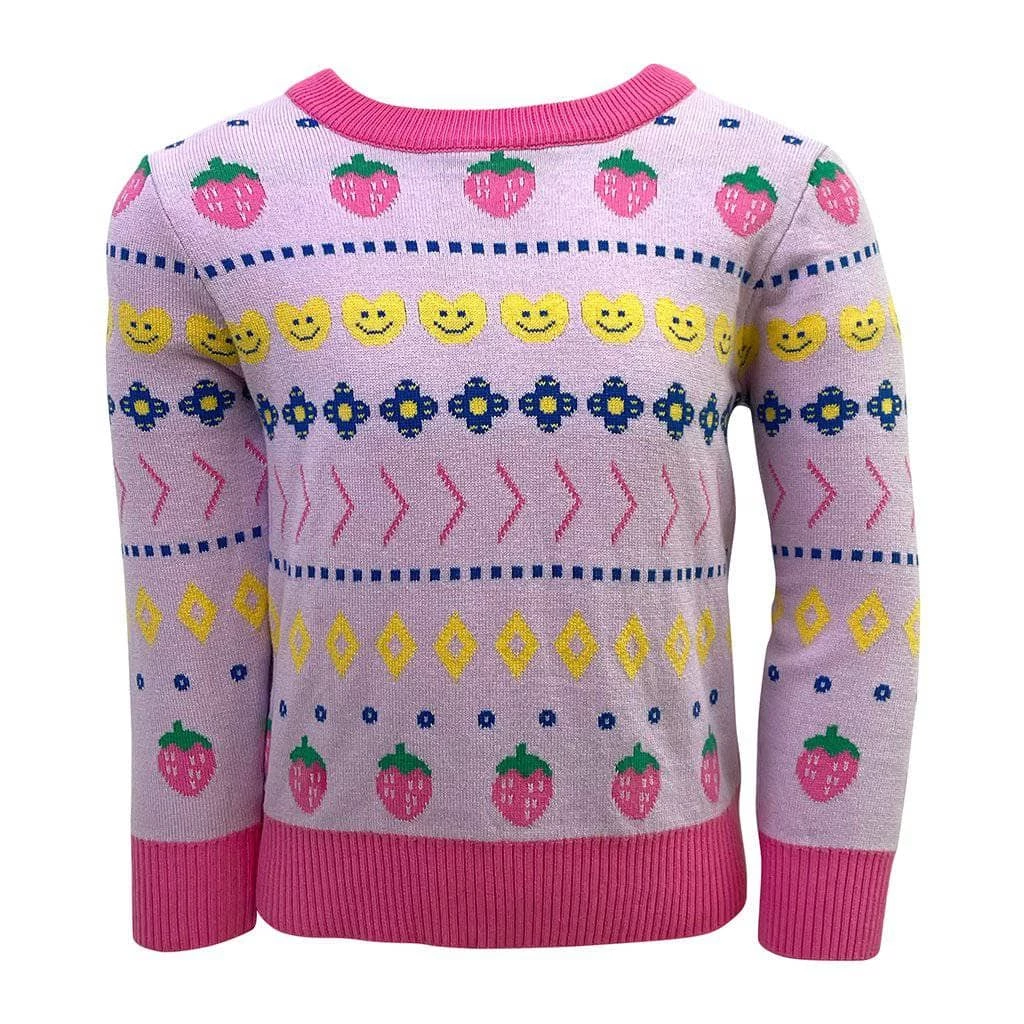 lavender printed crew neck light weight sweater with strawberries, heart smileys, flowers, and diamonds!