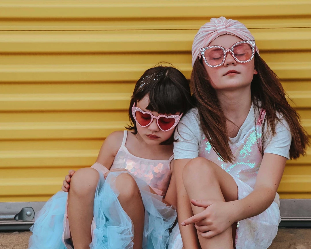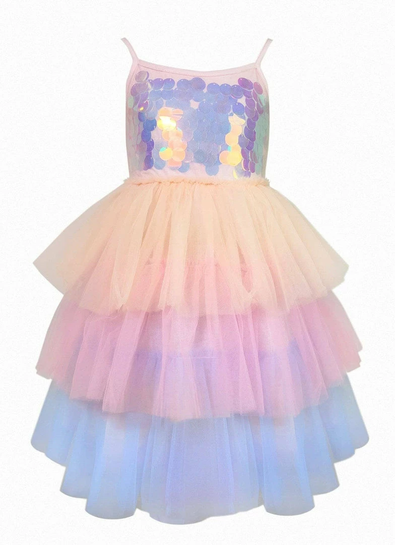 Shining paillette sequin top with a 3-tiered tulle tutu skirt in peach, pink, and blue.