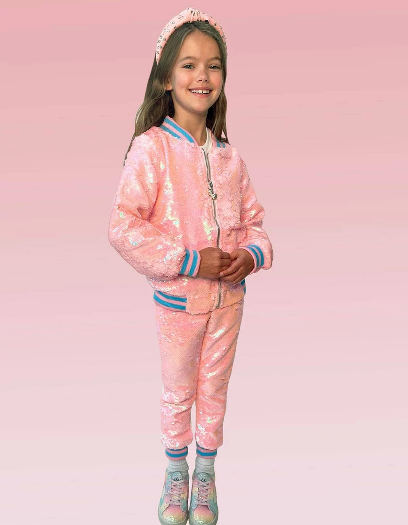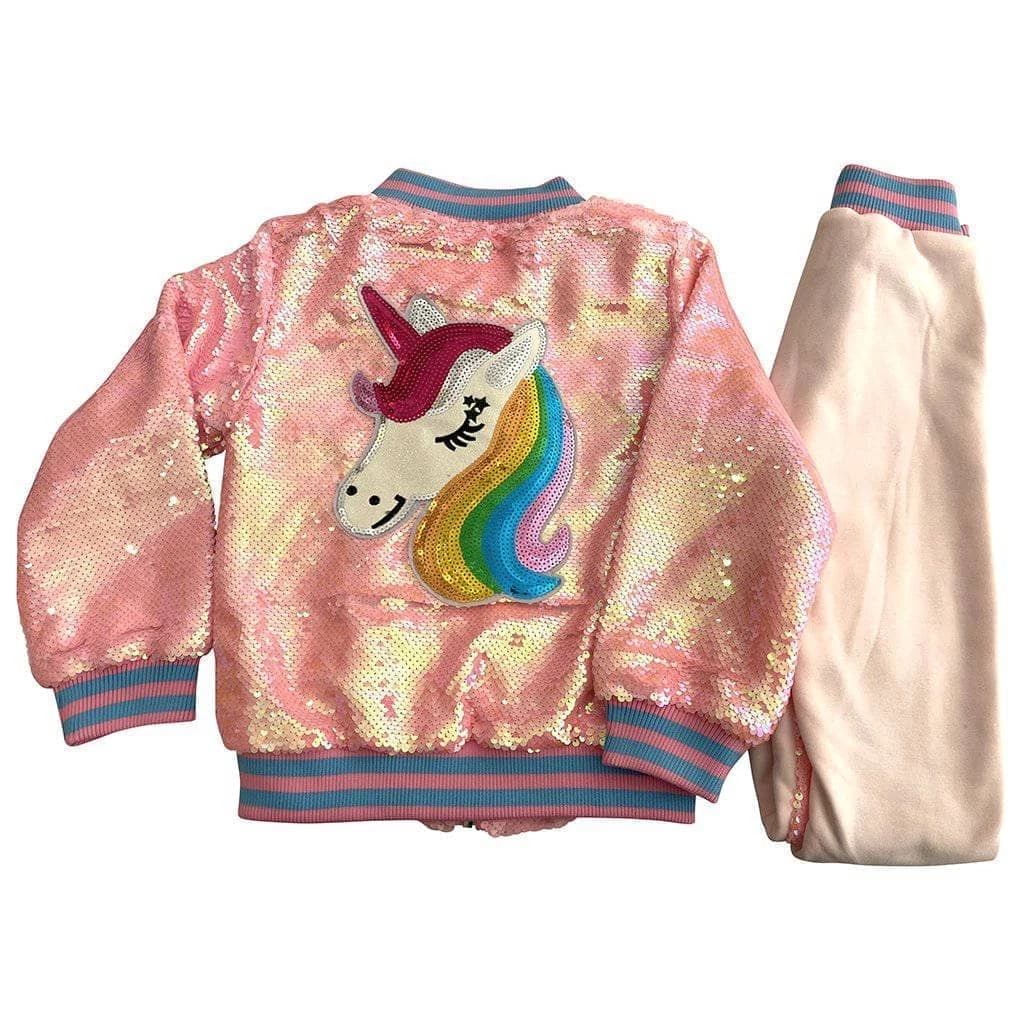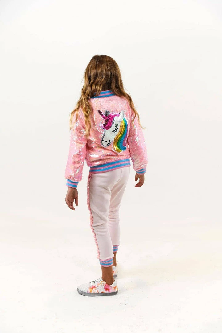Fully sequined pink bomber and jogger set with colorful unicorn patch on the back! The perfect outfit to make a statement!ย