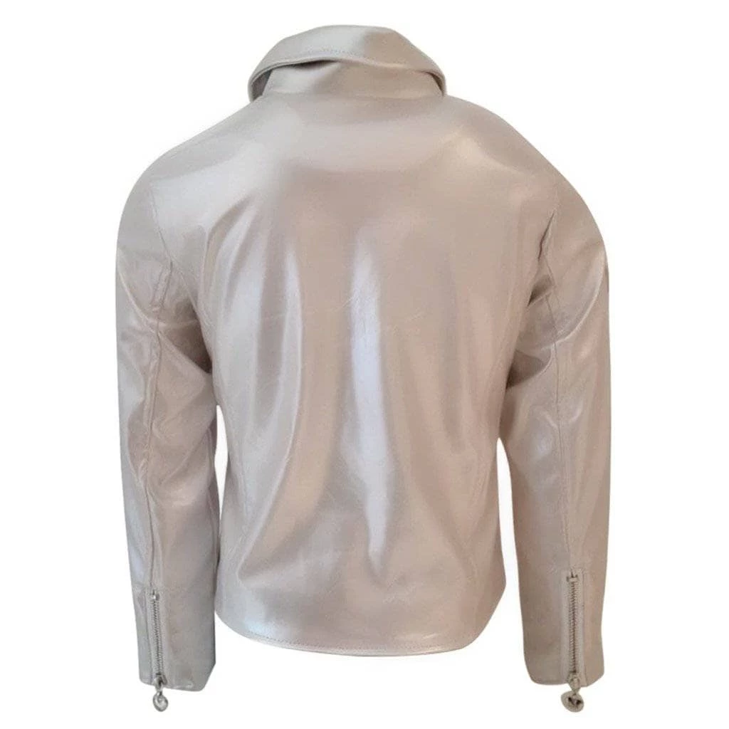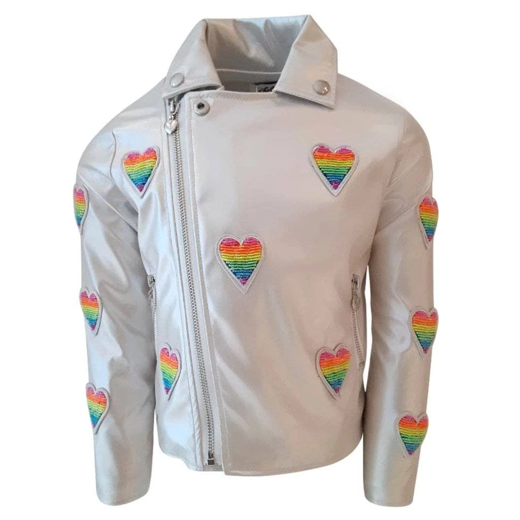 Cream shimmer champagne vegan leather jacket with rainbow beaded rainbow heart patches !ย