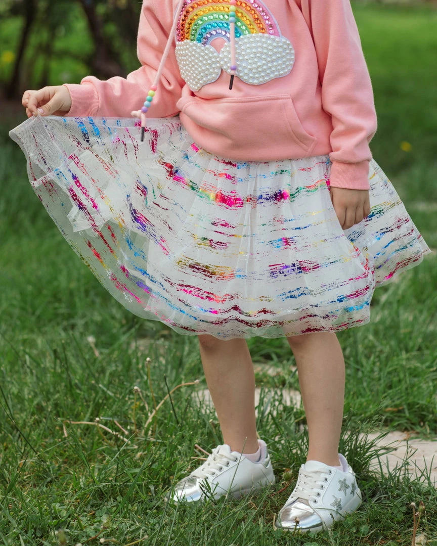 White tutu with neon rainbow waistband and foiled rainbow flakes!Β