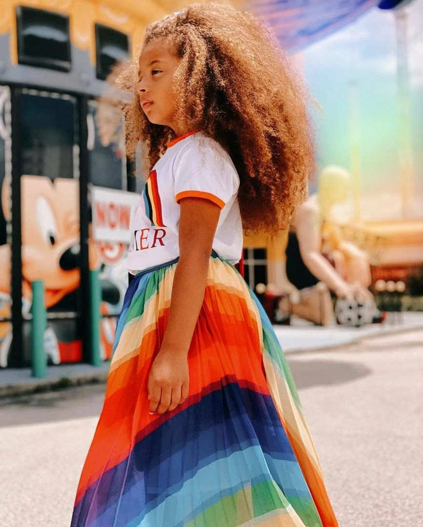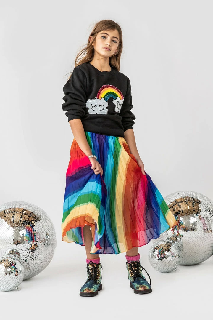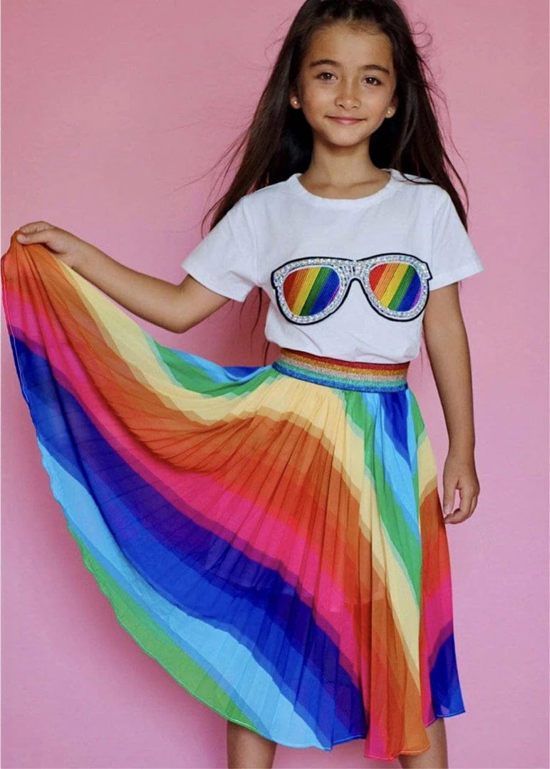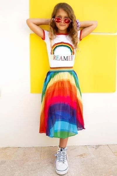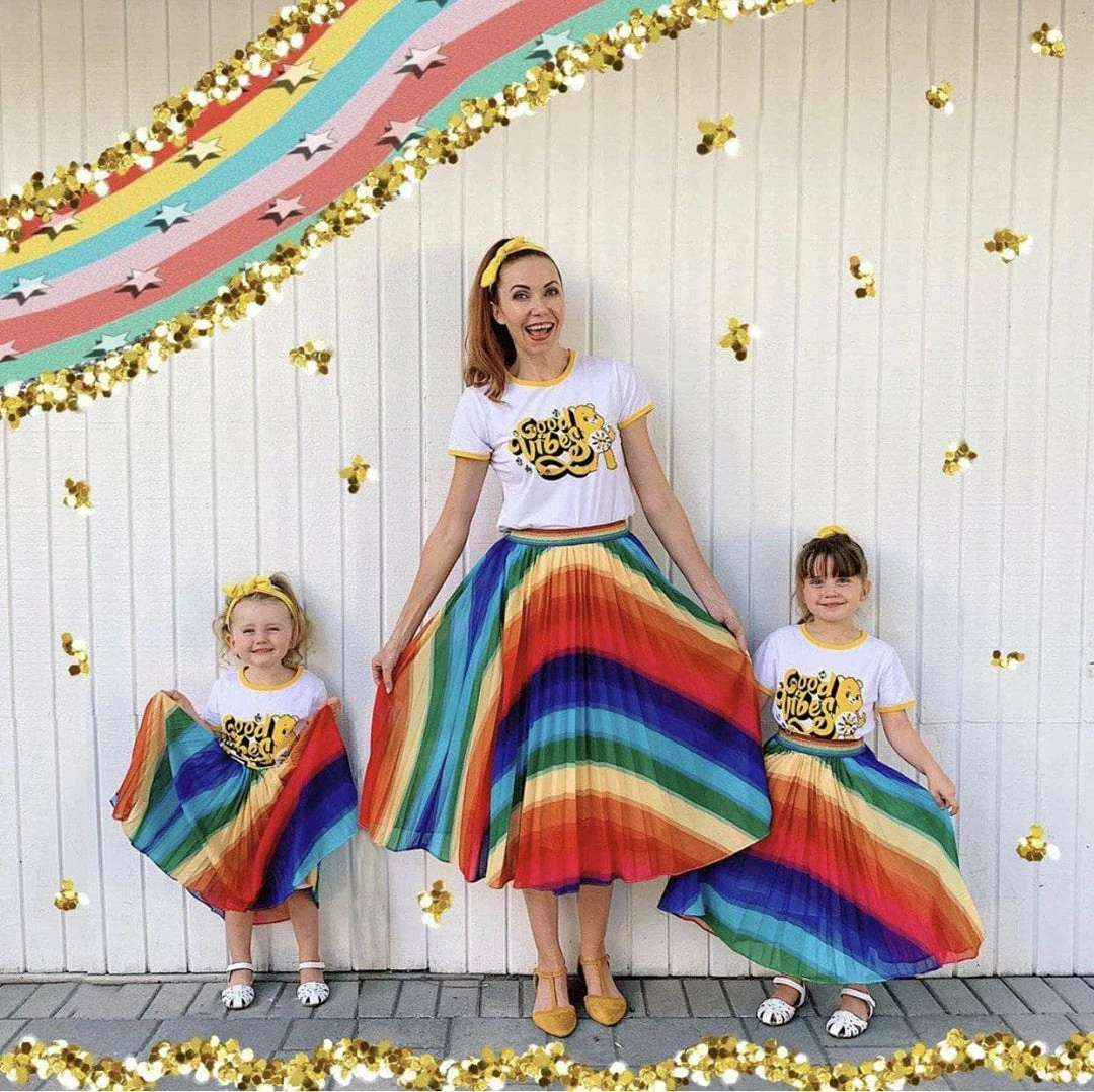 Rainbow twirls! This midi Rainbow skirt is the perfect new spring staple. Rock it paired with our new dreamer teeย