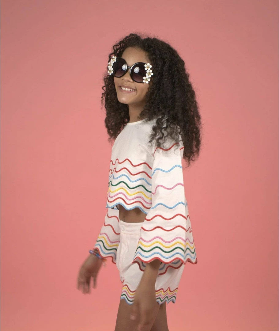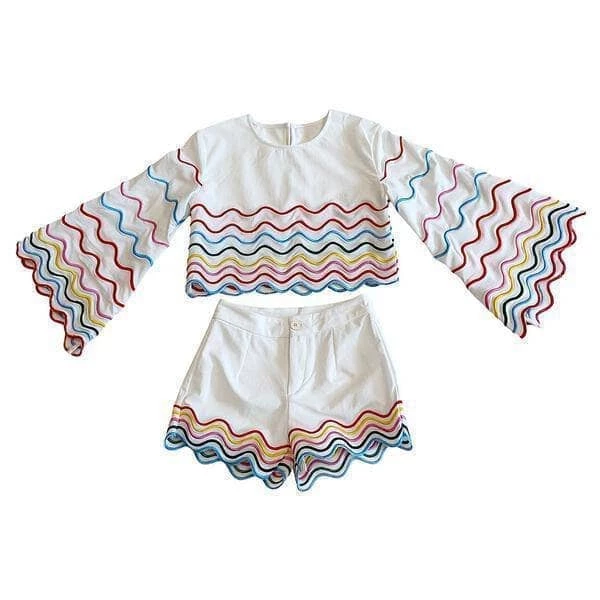 The perfect summer outfit! Rainbow linen lines with flare bell sleeves and matching shorts!ย