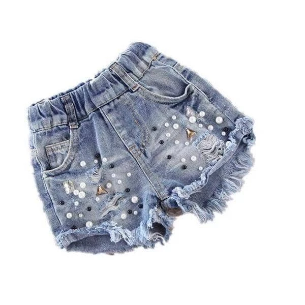 Elastic waisted light wash denim shorts with gold studs, pearls, and rhinestones!Β