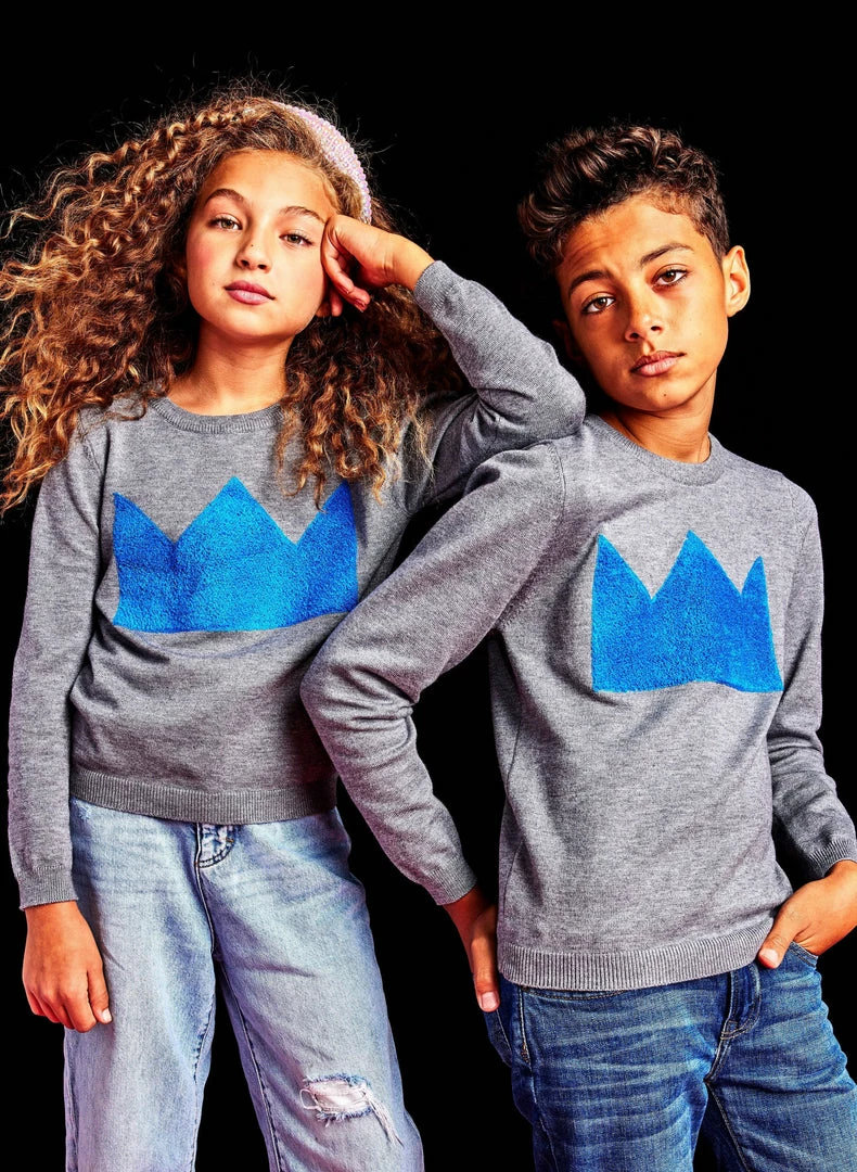 Grey sweater with cobalt blue puff crown on the front! Perfect for boys and girls.ย