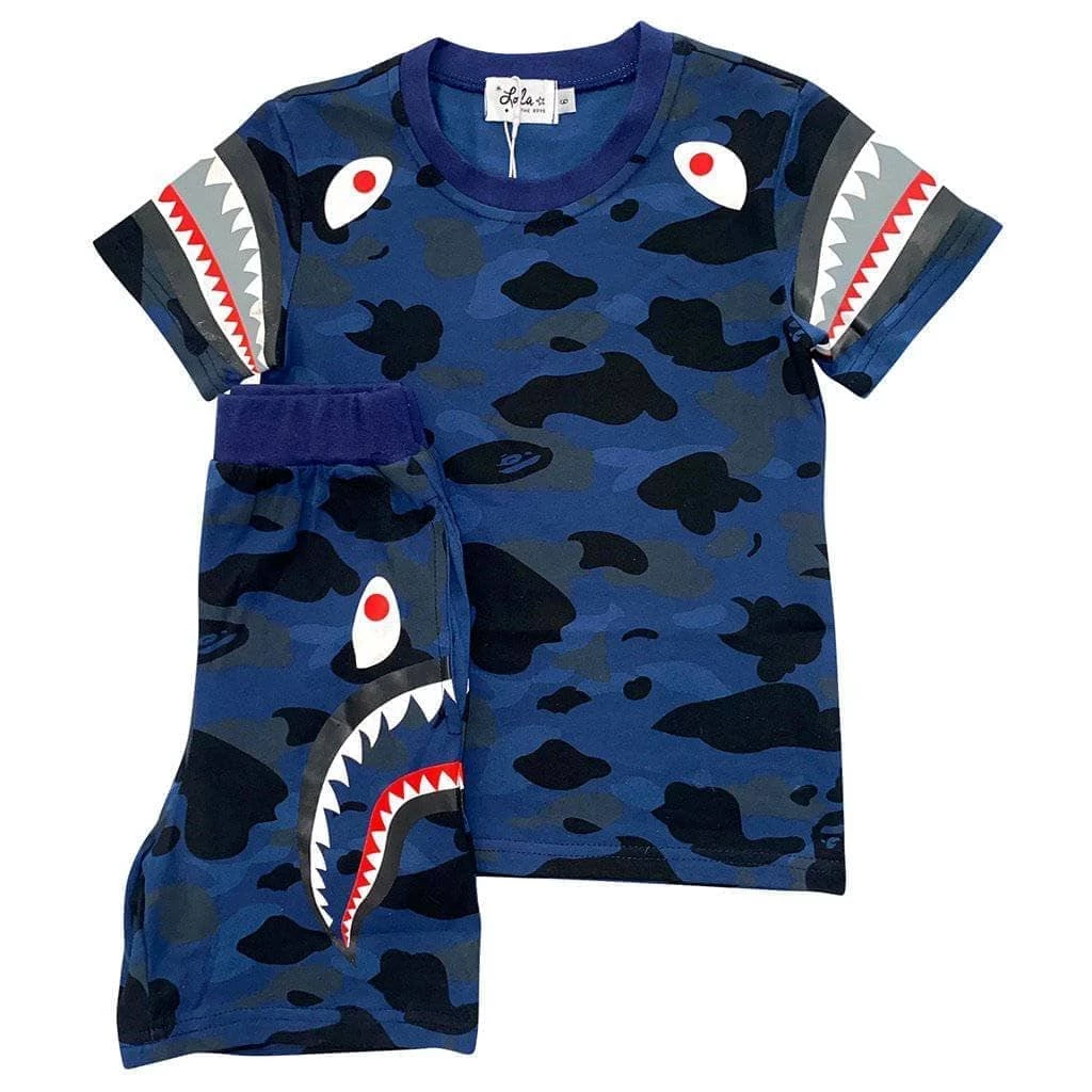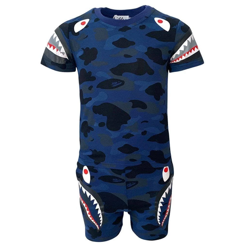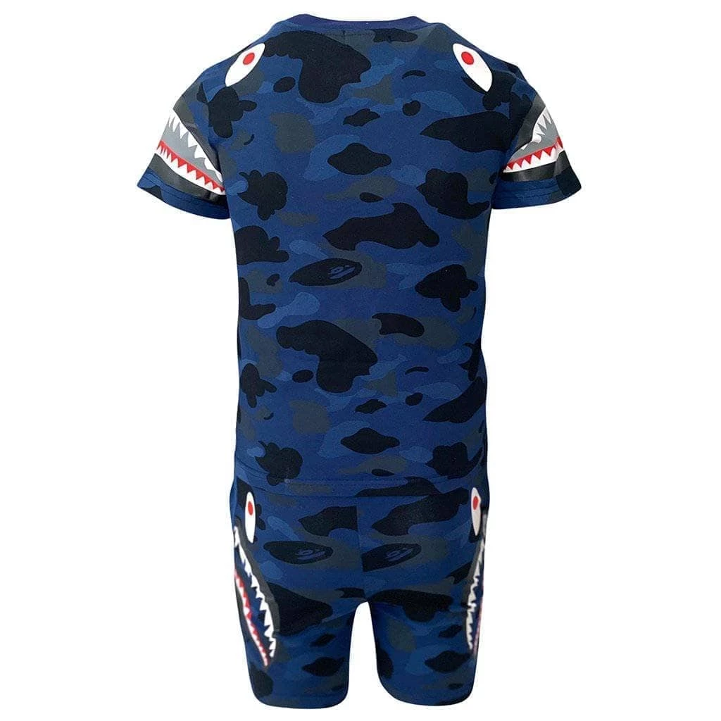 The coolest shark inspired set with blue camo and shark teeth on the sleeves and pant legs!Β