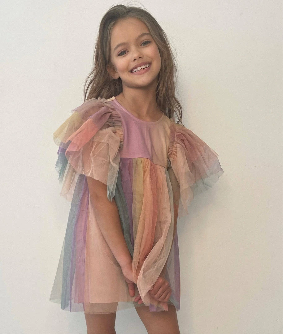 Baby doll style tulle dress with flutter sleeves and tulle skirt!Β