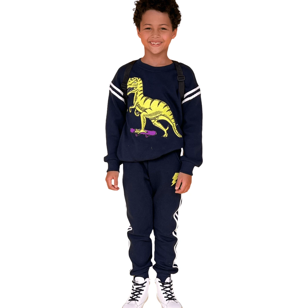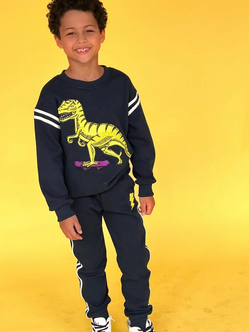Super thick and soft crewneck and jogger sets coming in cream and navy with a green T-Rex!
