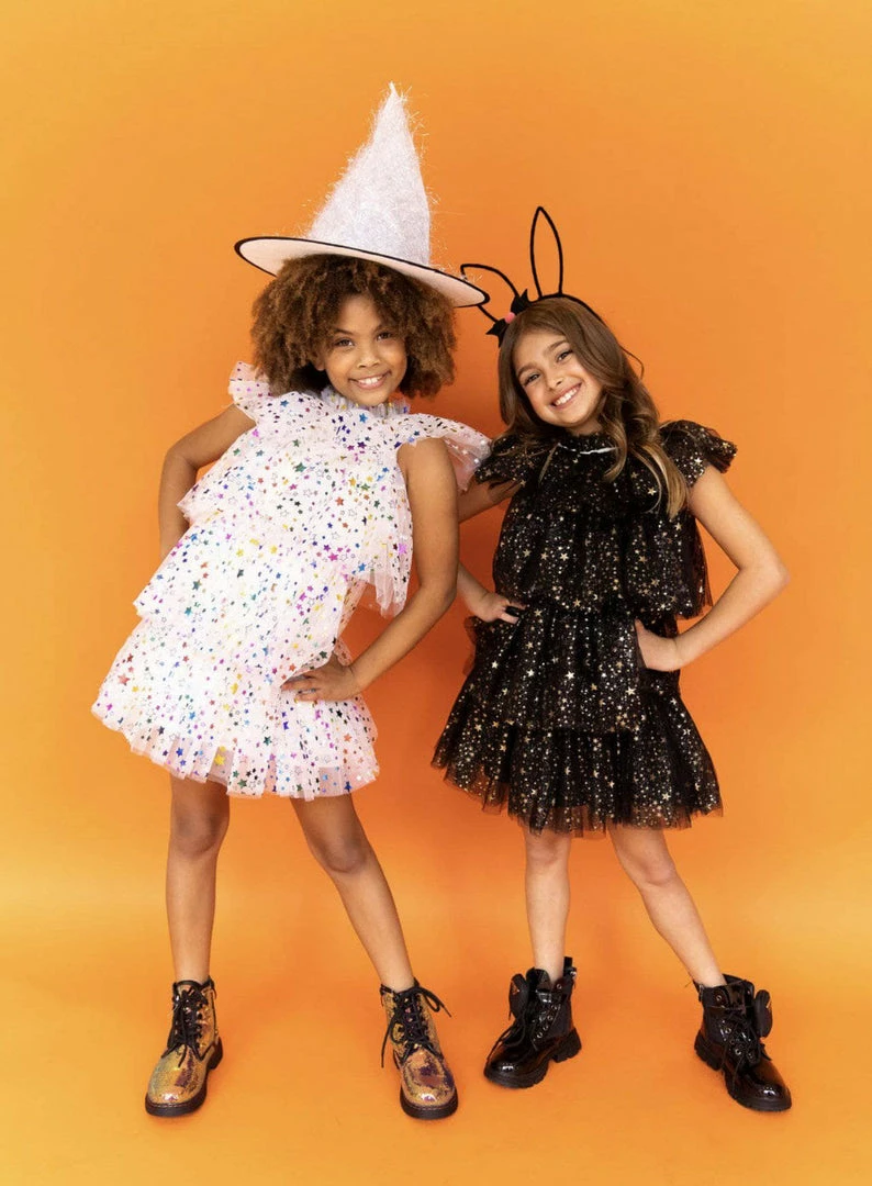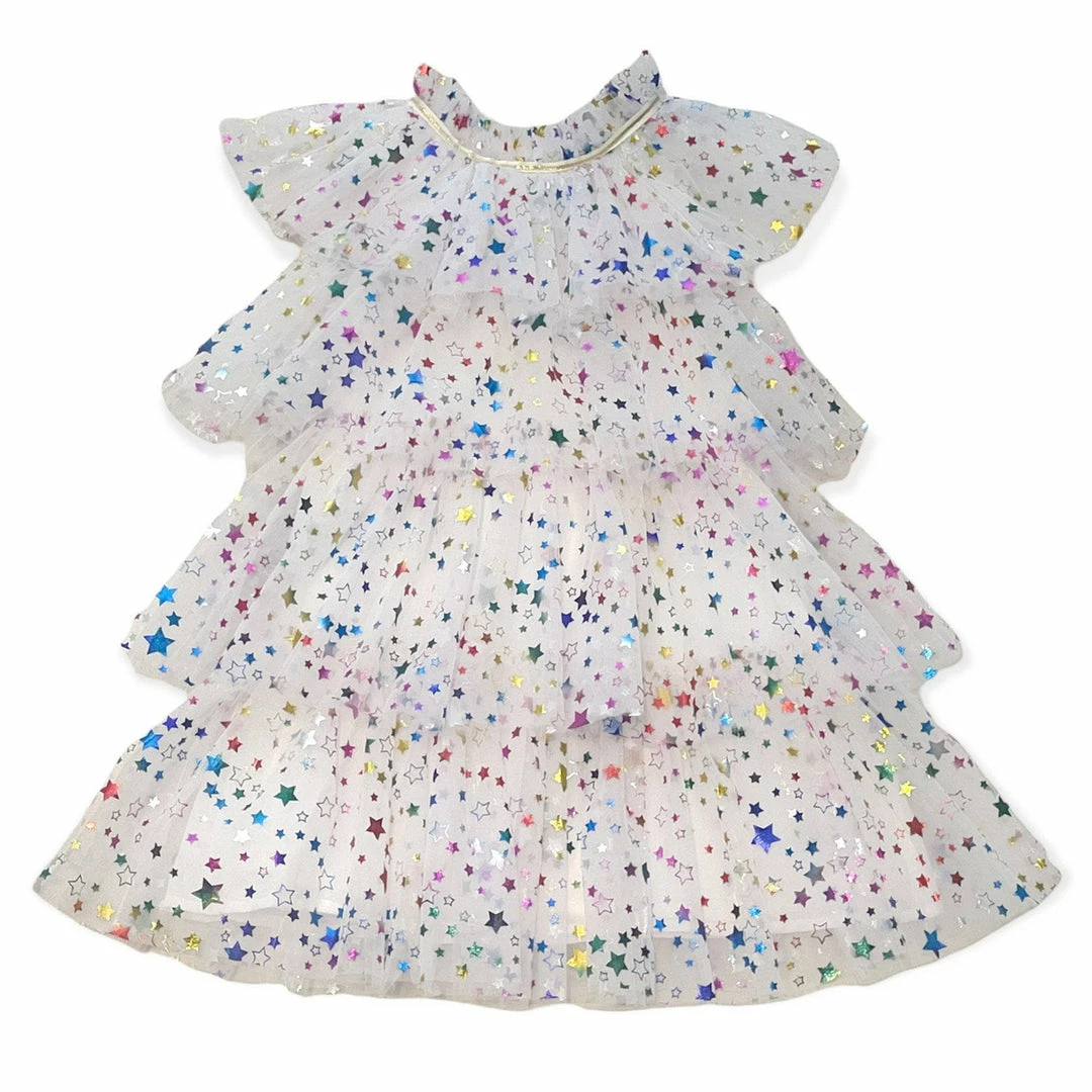 White tiered fluffy tulle dress with rainbow stars and gold trim!