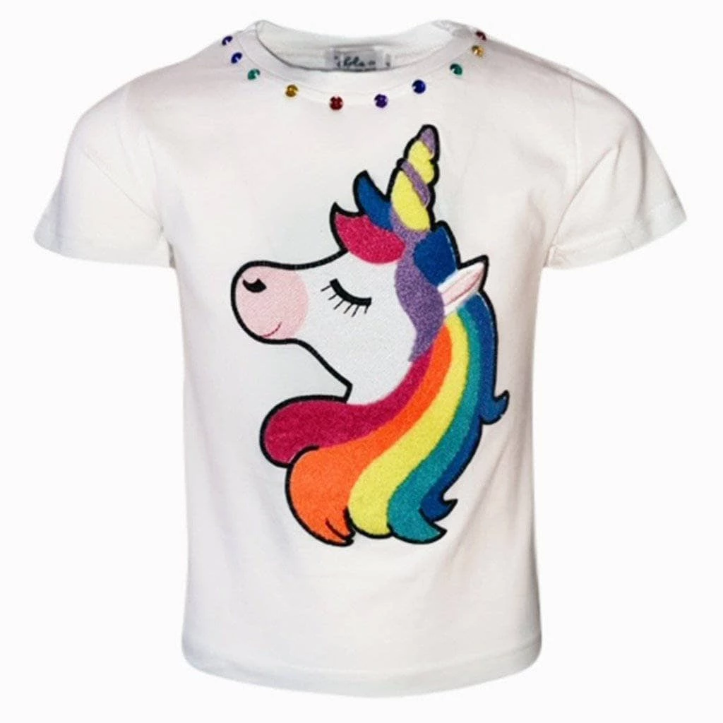 The cutest white tee with rainbow gems on the collar and neon unicorn patch front and center!Β