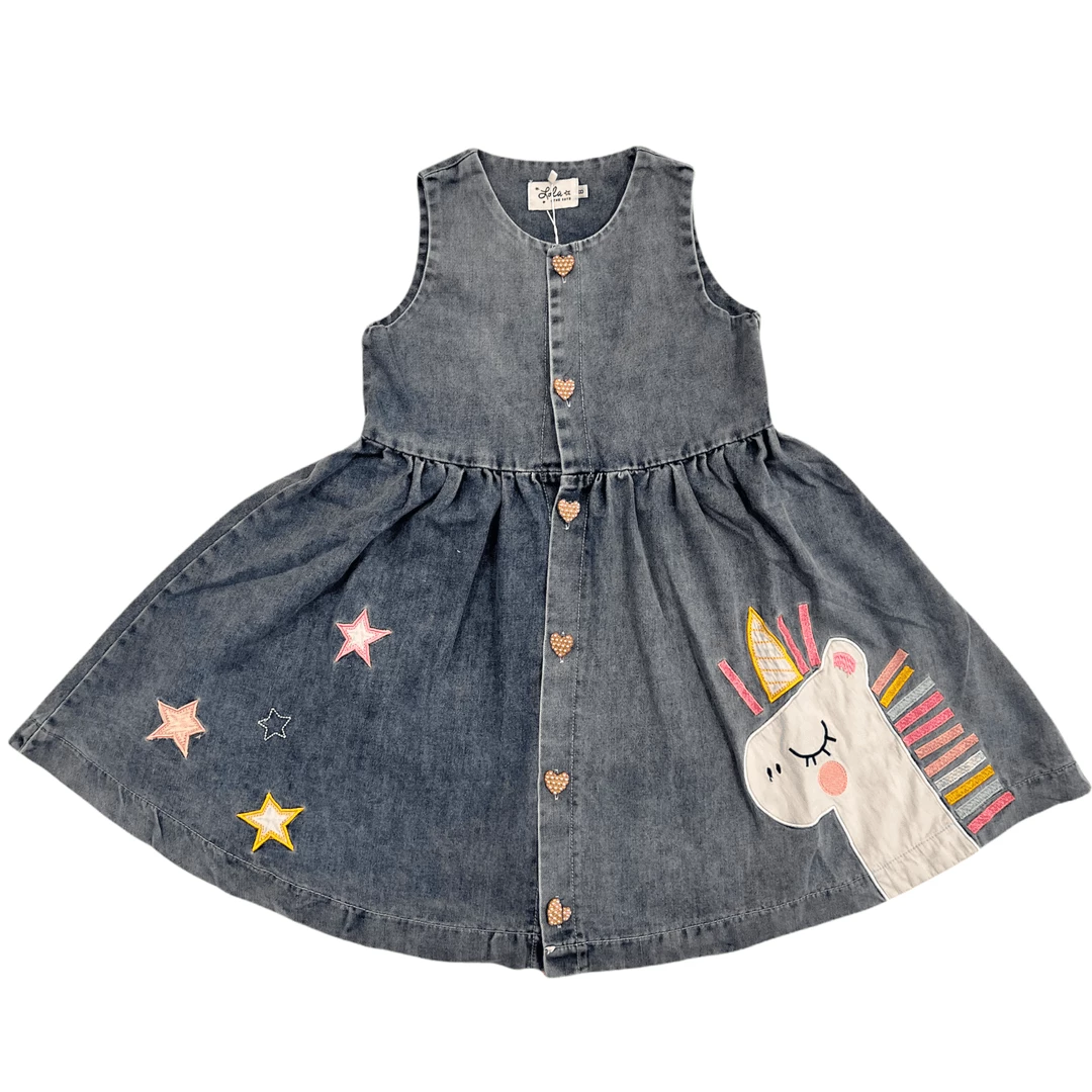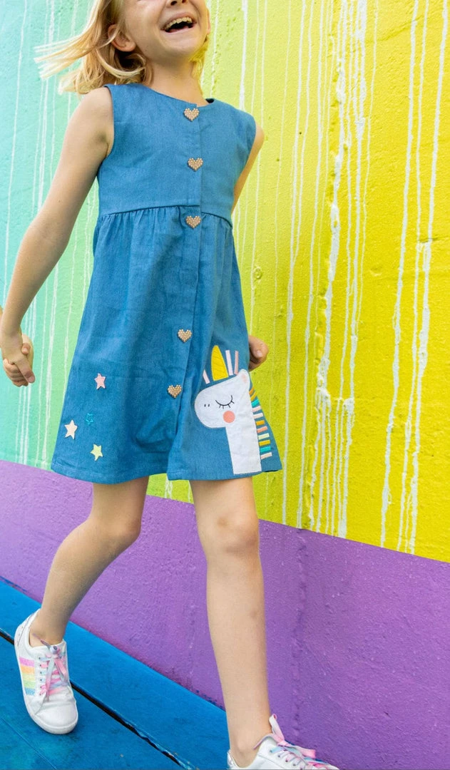pearl heart buttons with a unicorn-inspired denim dress.